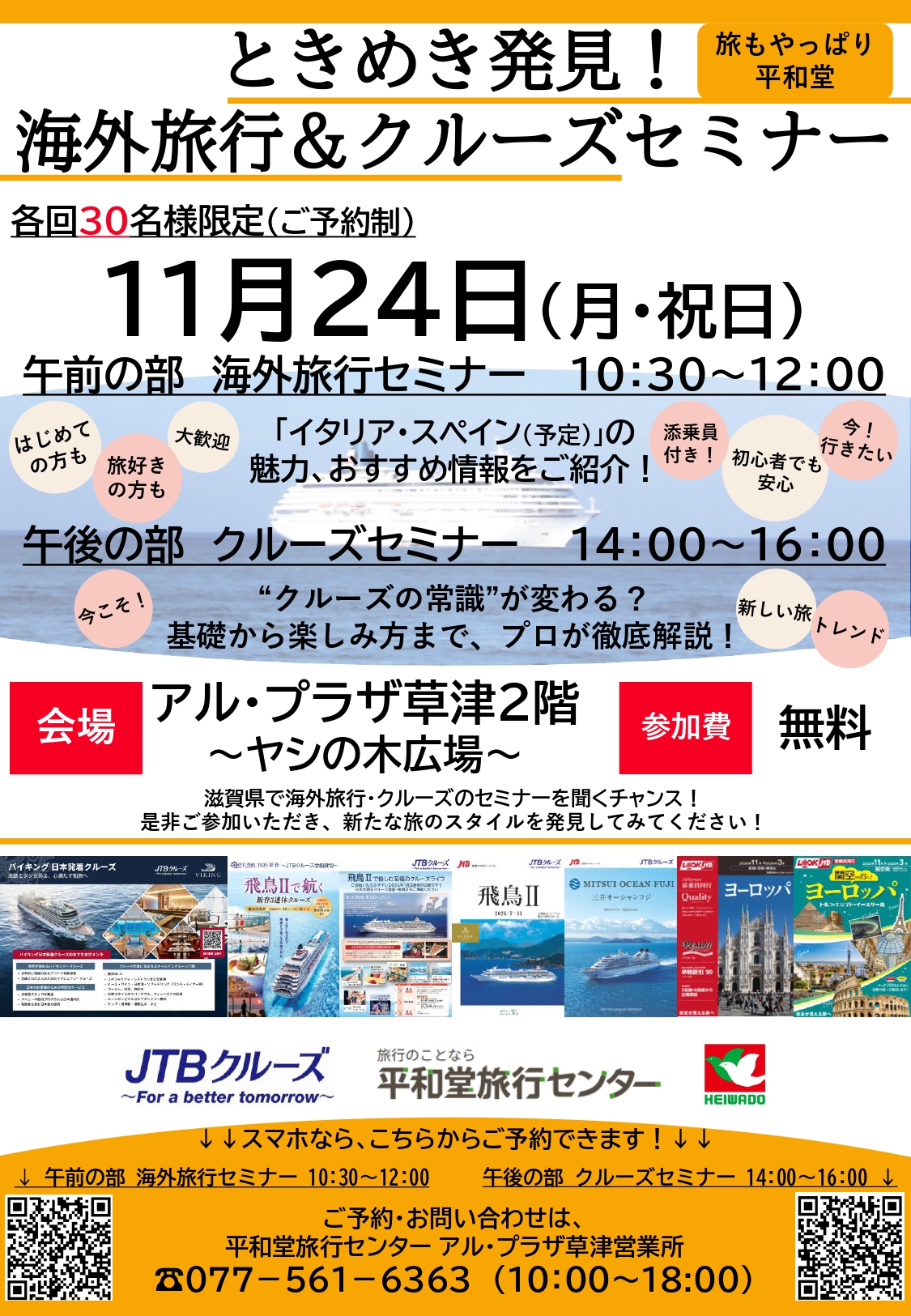 お知らせ 2025年10月31日(金) 滋賀県でセミナーを聞くチャンス!海外旅行&クルーズセミナー アル・プラザ草津で開催 人気のイタリア・スペイン中心にヨーロッパの人気コースや最新現地情報をご案内。クルーズはテレビでもお馴染みのクルーズマスターが登壇!飛鳥Ⅱ・飛鳥Ⅲ中心に船や商品情報を楽しくレクチャーします。聴けば納得、お客様の旅選びに役立つセミナーです。海外旅行もクルーズも、初めての方、久しぶりの方、興味ある方、お気軽にご参加ください。滋賀県でセミナーを聞けるチャンス!是非この機会にお申込みくださいませ(^^)/申込みはこちらから 海外旅行 クルーズ