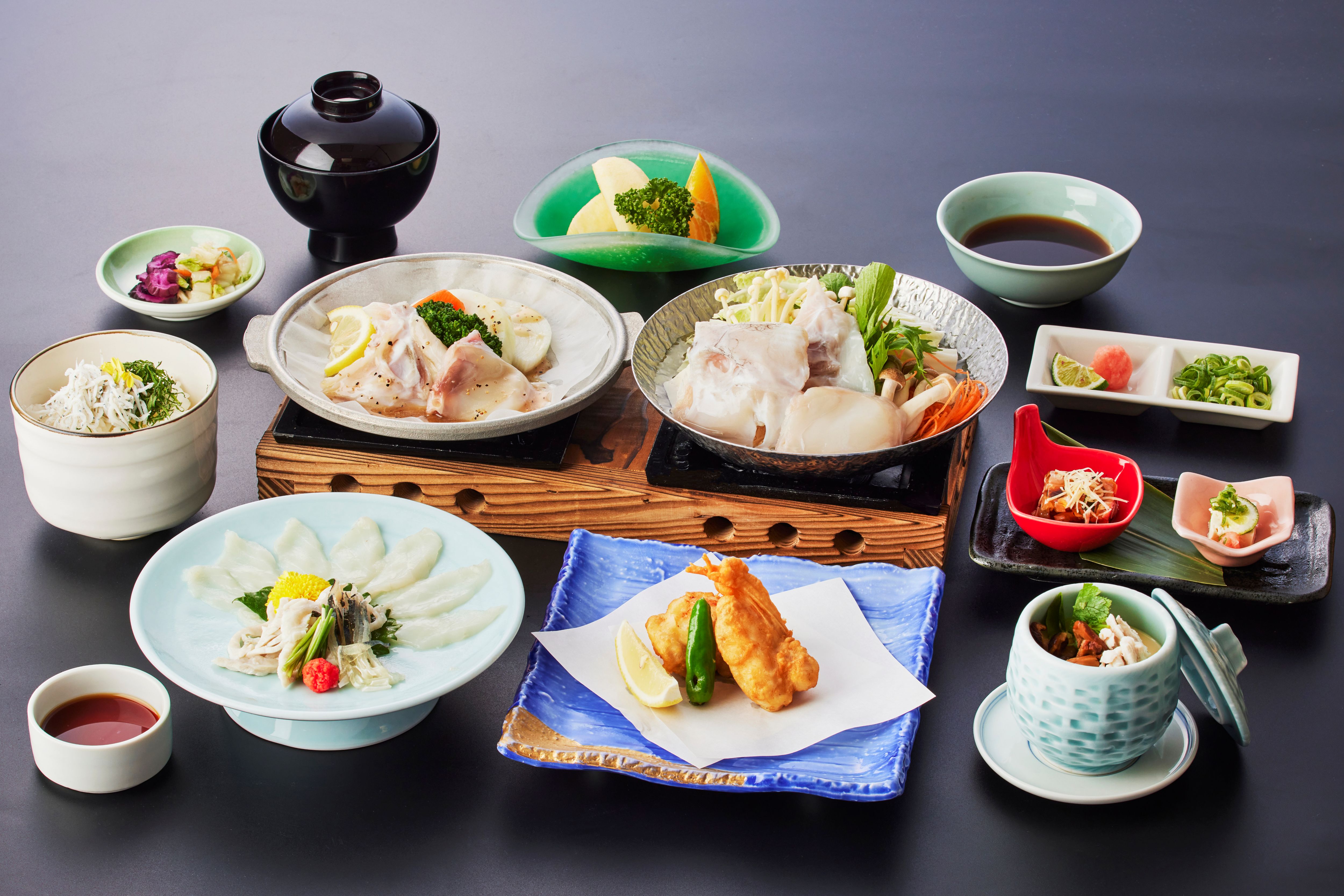 昼食は「3年とらふぐ」をご用意。てっさやてっちりなど、旨みの詰まった贅沢メニューを堪能いただけます。
