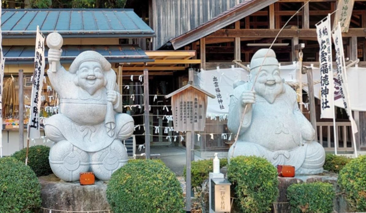 恵比寿さまと大黒さまの石像のお腹をさすると宝くじが当たるといういわれがある出雲福徳神社を訪れます。